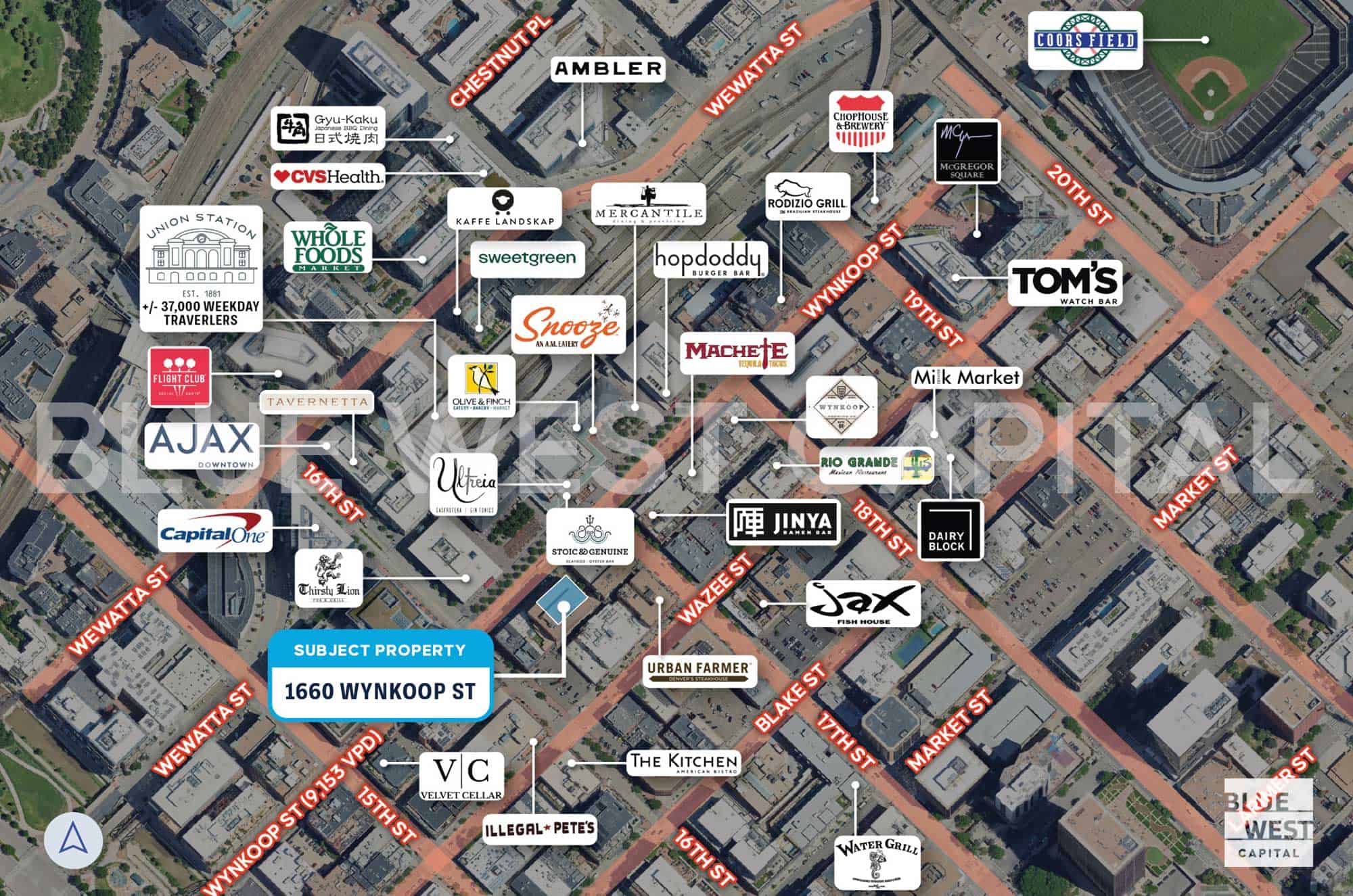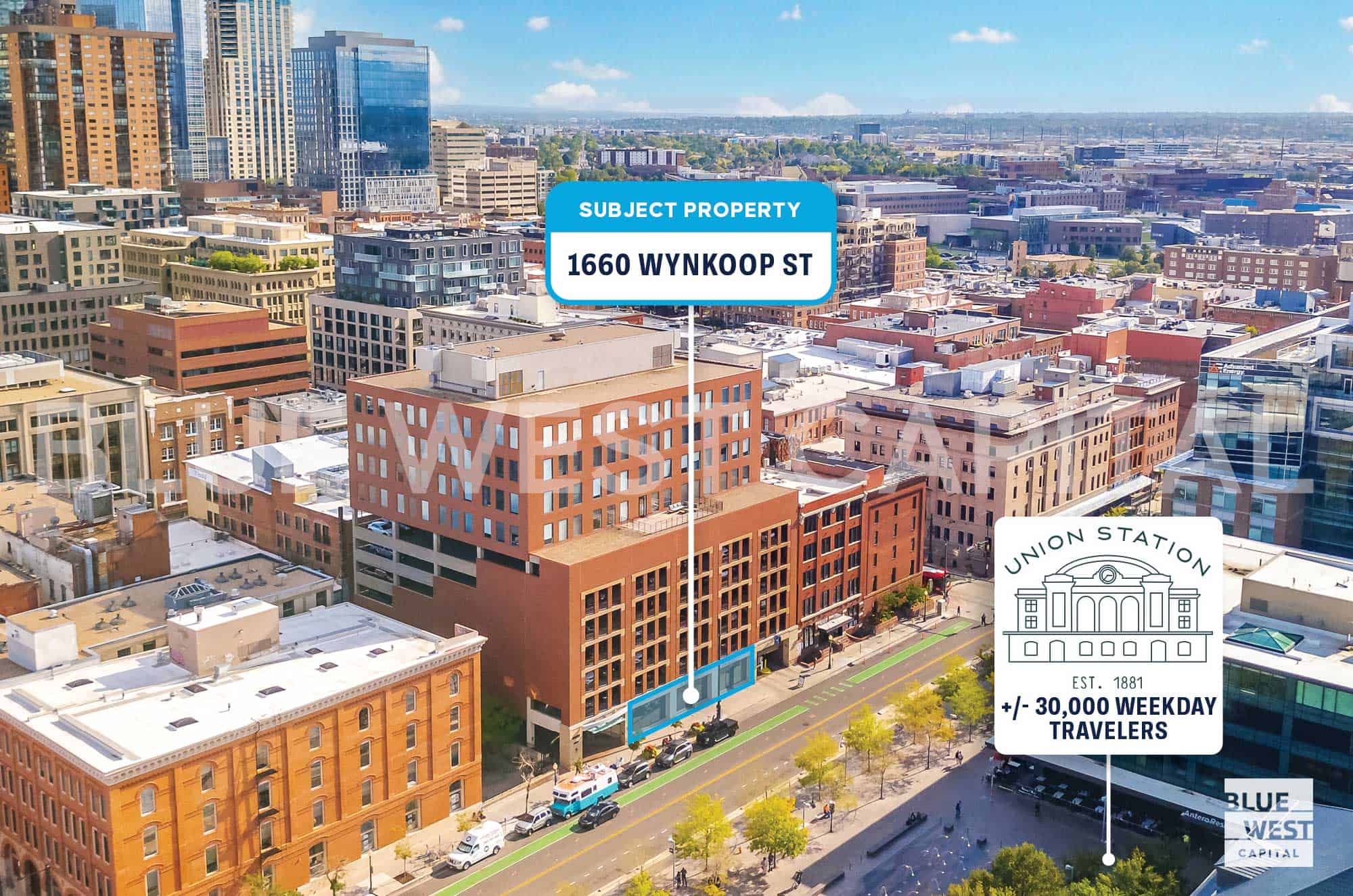 Blue West Capital is pleased to present the opportunity to lease prime street-level retail space at 1660 Wynkoop Street, located directly across from Denver Union Station in the heart of LoDo. The property offers three street-level retail suites totaling up to 6,066 square feet, with spaces of 1,147 SF, 2,119 SF, and 2,800 SF that can be leased individually or combined to accommodate a range of retail, restaurant, or service concepts. Positioned along one of downtown Denver’s most active pedestrian corridors, the site benefits from exceptional visibility and foot traffic driven by Union Station’s 10M+ annual visitors and approximately 30,000 daily commuters, as well as the surrounding mix of hotels, offices, and residential density that defines LoDo as one of Denver’s premier urban destinations.
