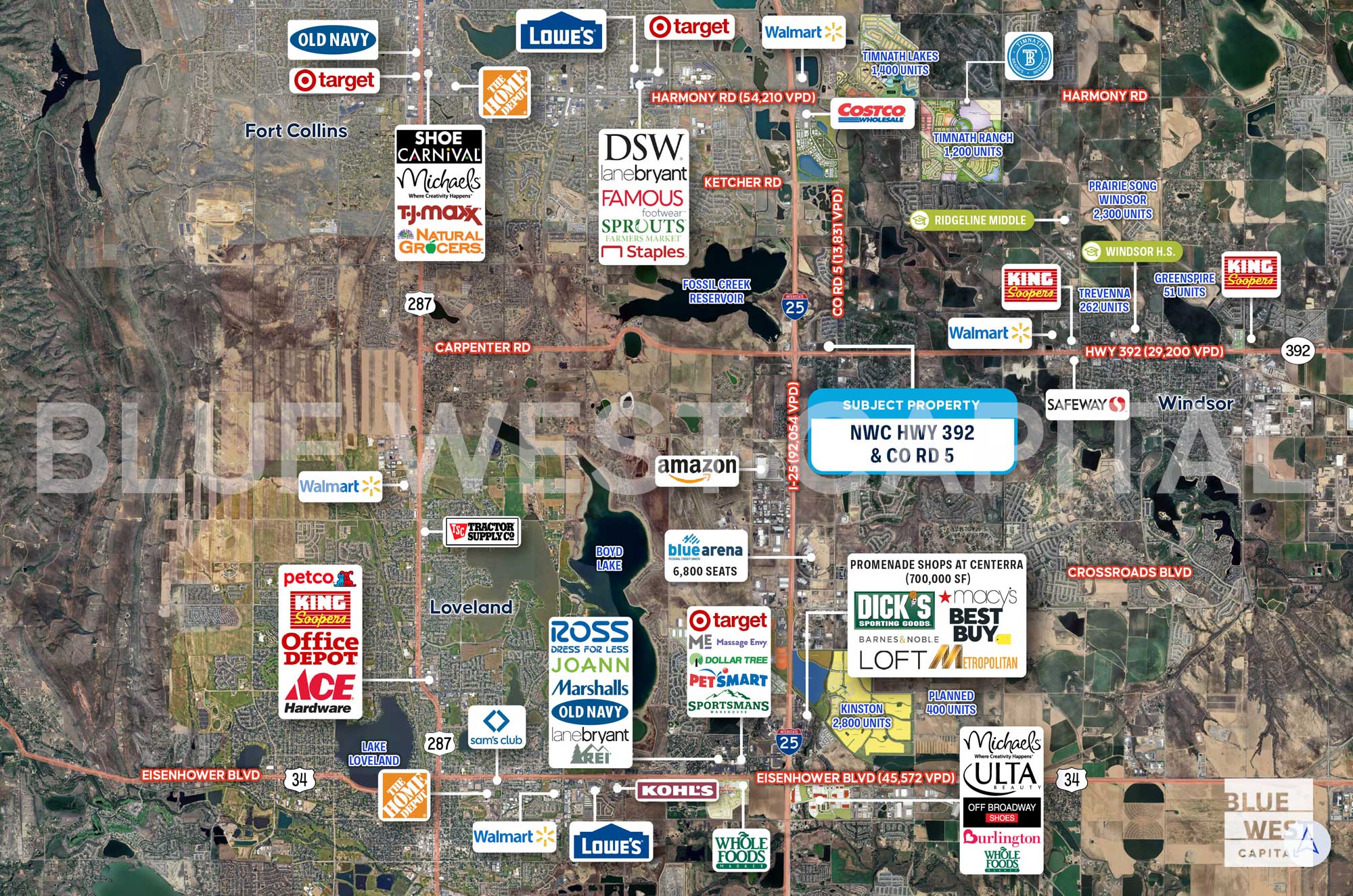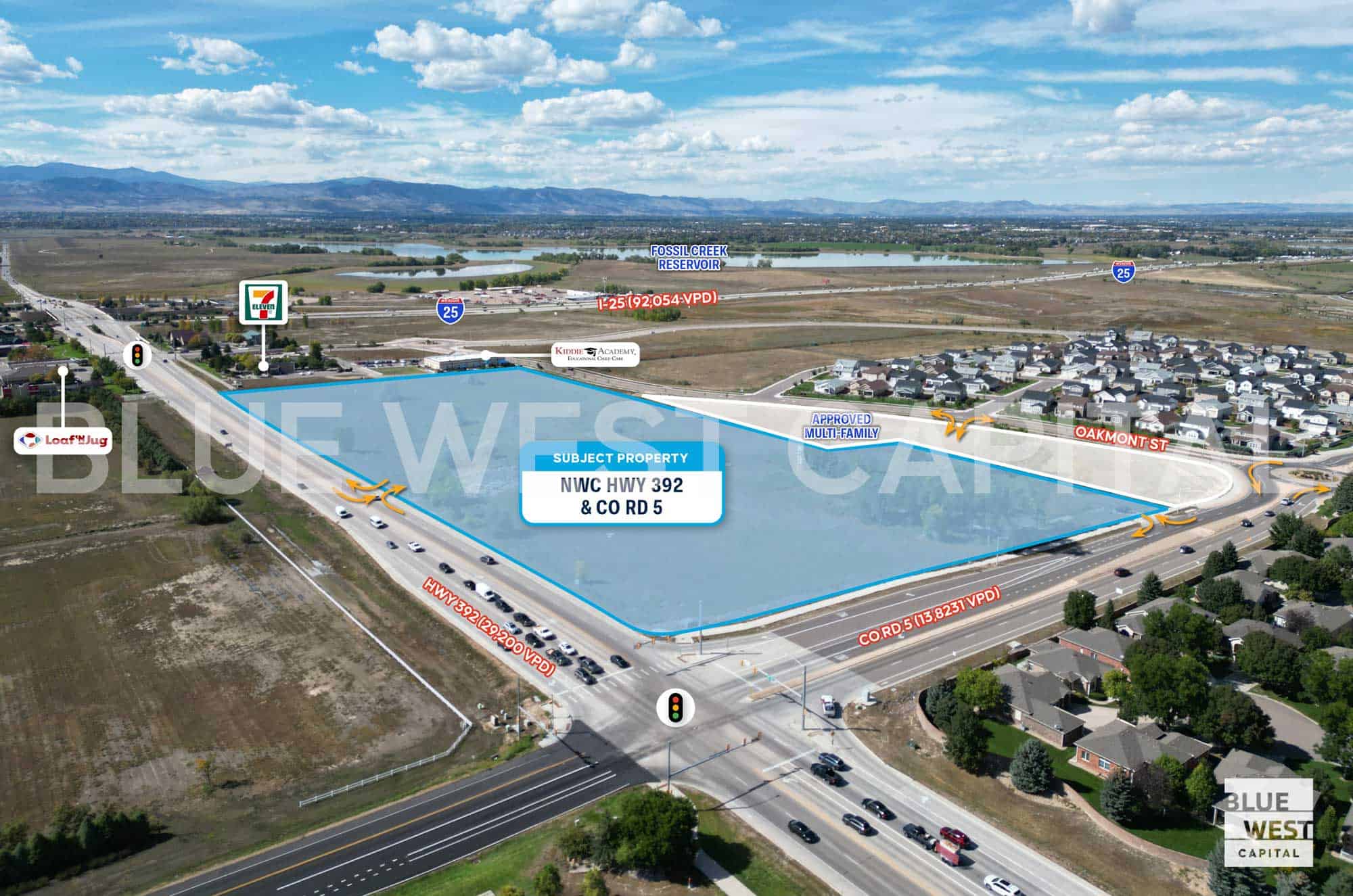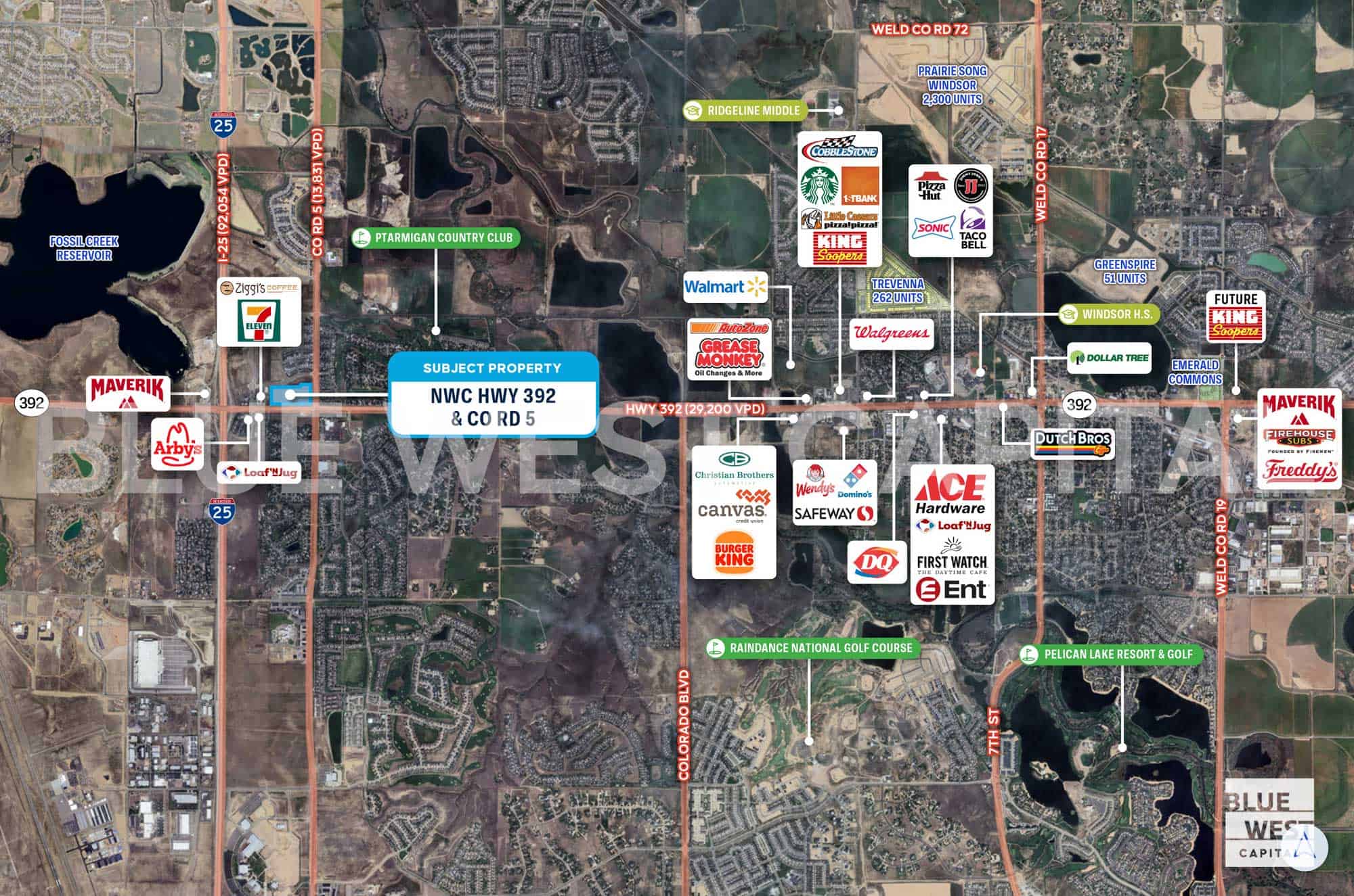 Blue West Capital is pleased to present Hwy 392 & CO Rd 5 in Windsor, Colorado, a 17.3-acre commercial land opportunity available For Sale, Build To Suit, or Ground Lease. Zoned General Commercial with flexible pad sizing, the site supports a range of retail, service, and mixed commercial development concepts. Positioned at a highly visible intersection with strong regional connectivity, this offering provides a scalable land position in one of Northern Colorado’s primary growth corridors.