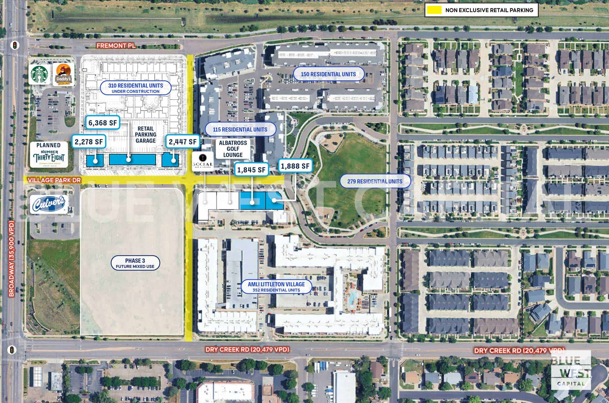 Blue West Capital is pleased to exclusively offer ground-floor retail at AMLI Littleton Village which offers urban-like densities in a suburban setting. Capture over 650 residential units in the immediate area. The remaining retail spaces would be ideal for daily needs, fitness, restaurants, and services. Additional retail and residential is planned to the West.