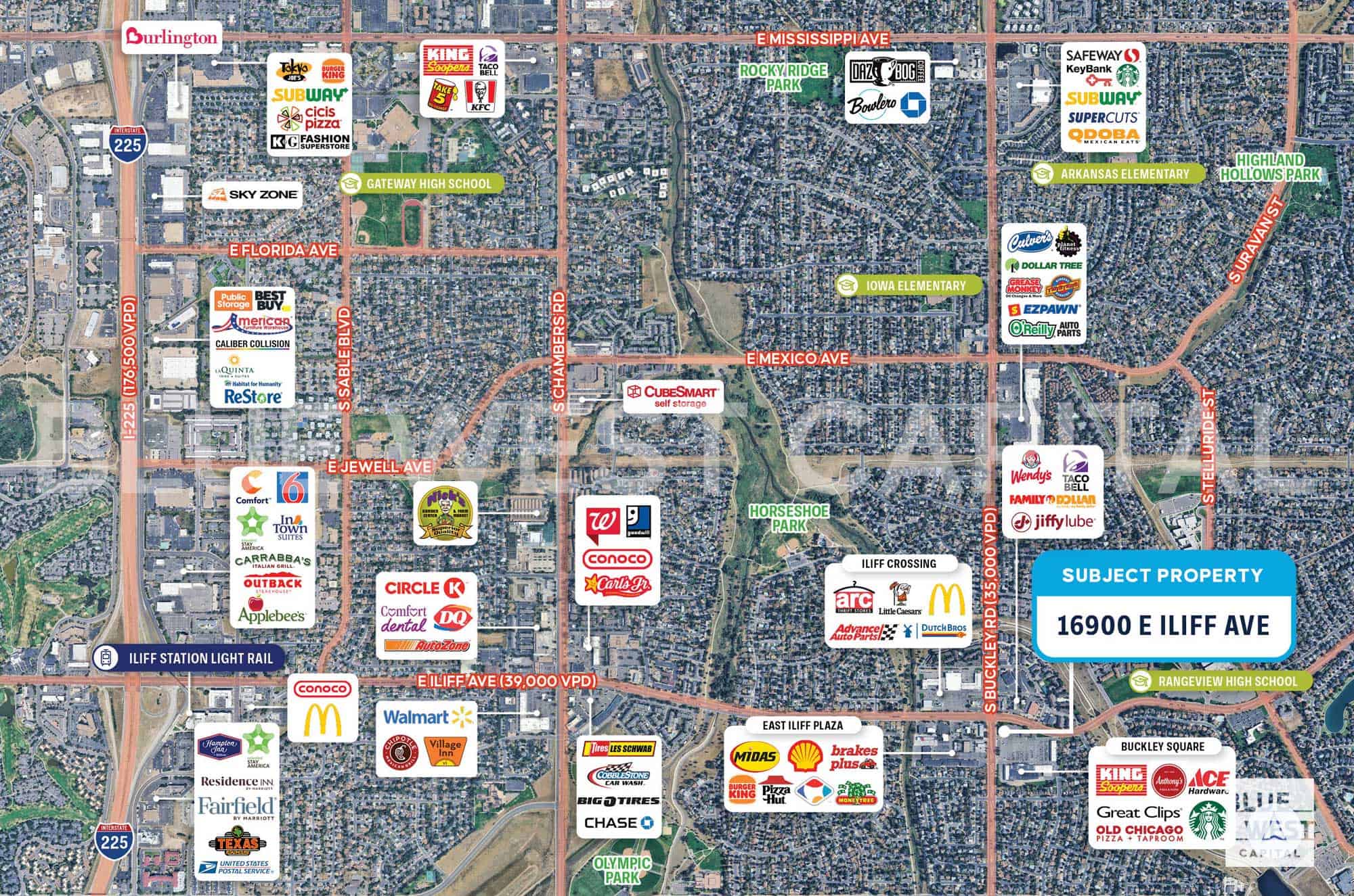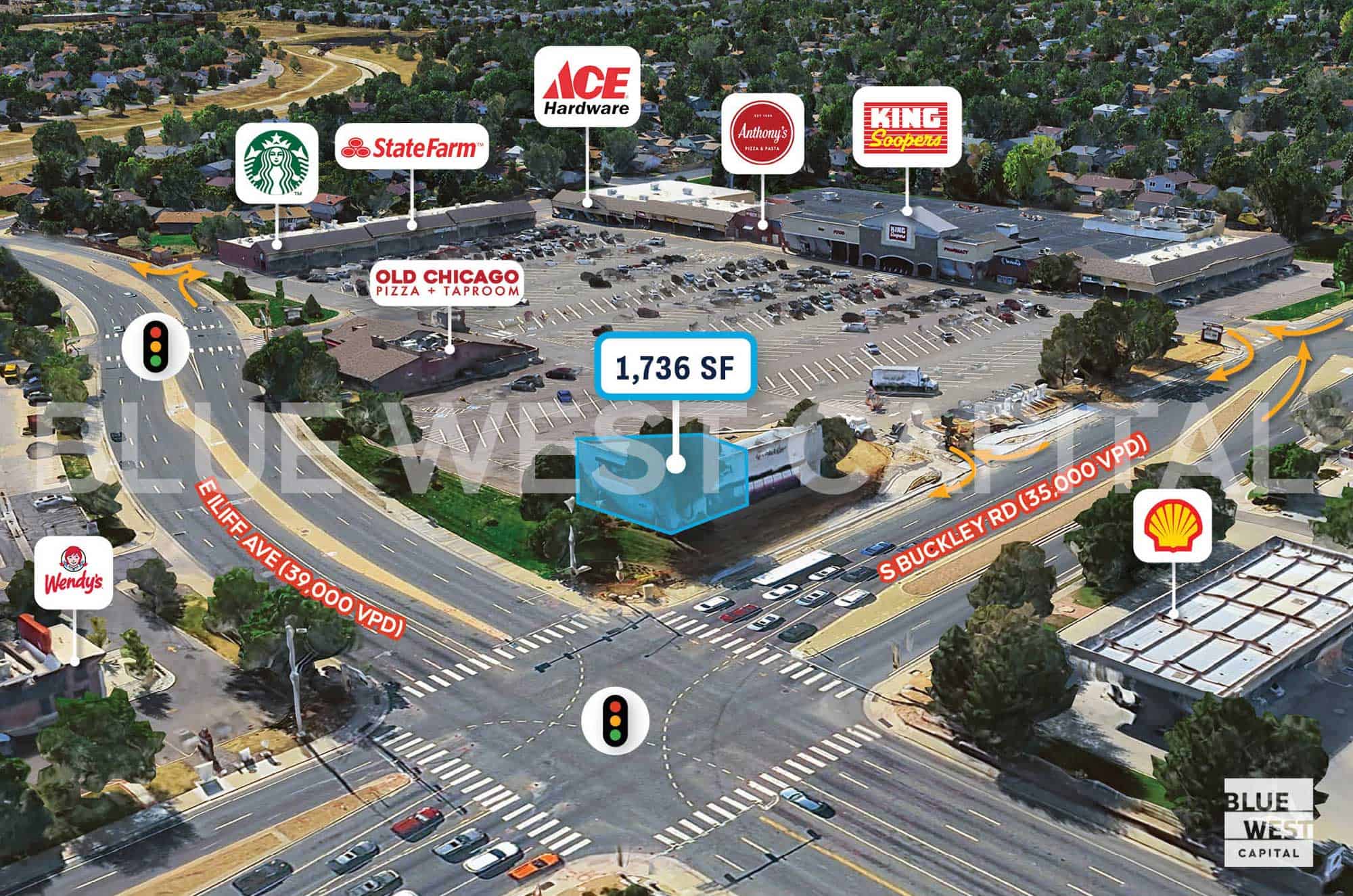 Blue West Capital is pleased to present a highly visible retail opportunity at the signalized intersection of E Iliff Avenue and S Buckley Road in Aurora, Colorado. Positioned within the established Buckley Road retail corridor, the property benefits from 35K vehicles per day, strong co-tenancy, and direct access to I-225. Anchored by King Soopers and surrounded by daily-needs and service retailers, the site offers consistent traffic and a dense residential customer base, making it well suited for retail, service, or wellness users seeking infill exposure within the Denver metro.