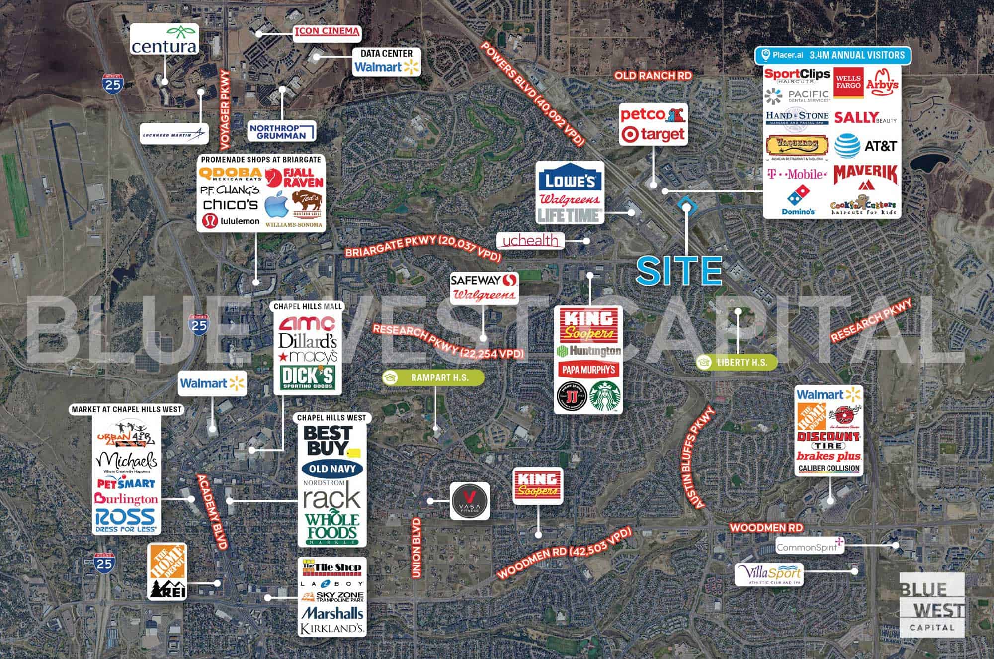 Blue West Capital is pleased to present a 1,400 square foot second-generation restaurant opportunity at The Shops at Briargate Crossing in Colorado Springs, Colorado. Positioned within Briargate’s dominant retail corridor, the center is shadow-anchored by Super Target and supported by strong national co-tenancy, generating consistent daily traffic and 3.4 million annual visitors per Placer.ai. The space includes an existing hood, grease trap, and sufficient power, allowing a new operator to capitalize on existing infrastructure while benefiting from immediate access to Powers Blvd. with 40,092 VPD. Surrounded by high household incomes and dense apartment communities, the property is well-positioned to capture neighborhood and regional demand.