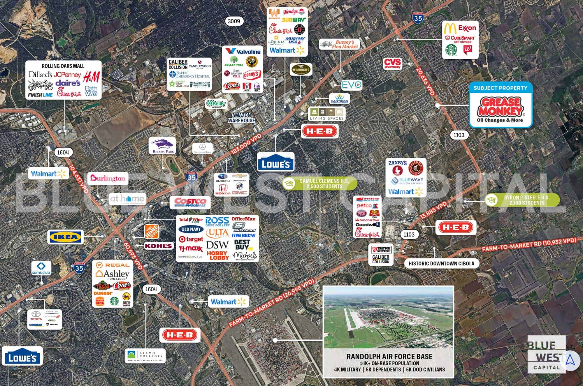 The asset features over $4 million in recent improvements and is offered below replacement cost. Strategically located along FM 1103 with immediate access to I-35 and Loop 1604, the property is surrounded by national retailers, active residential growth, and sits just 8 miles from Randolph Air Force Base—a major employment hub with a 14,000+ on-base population.