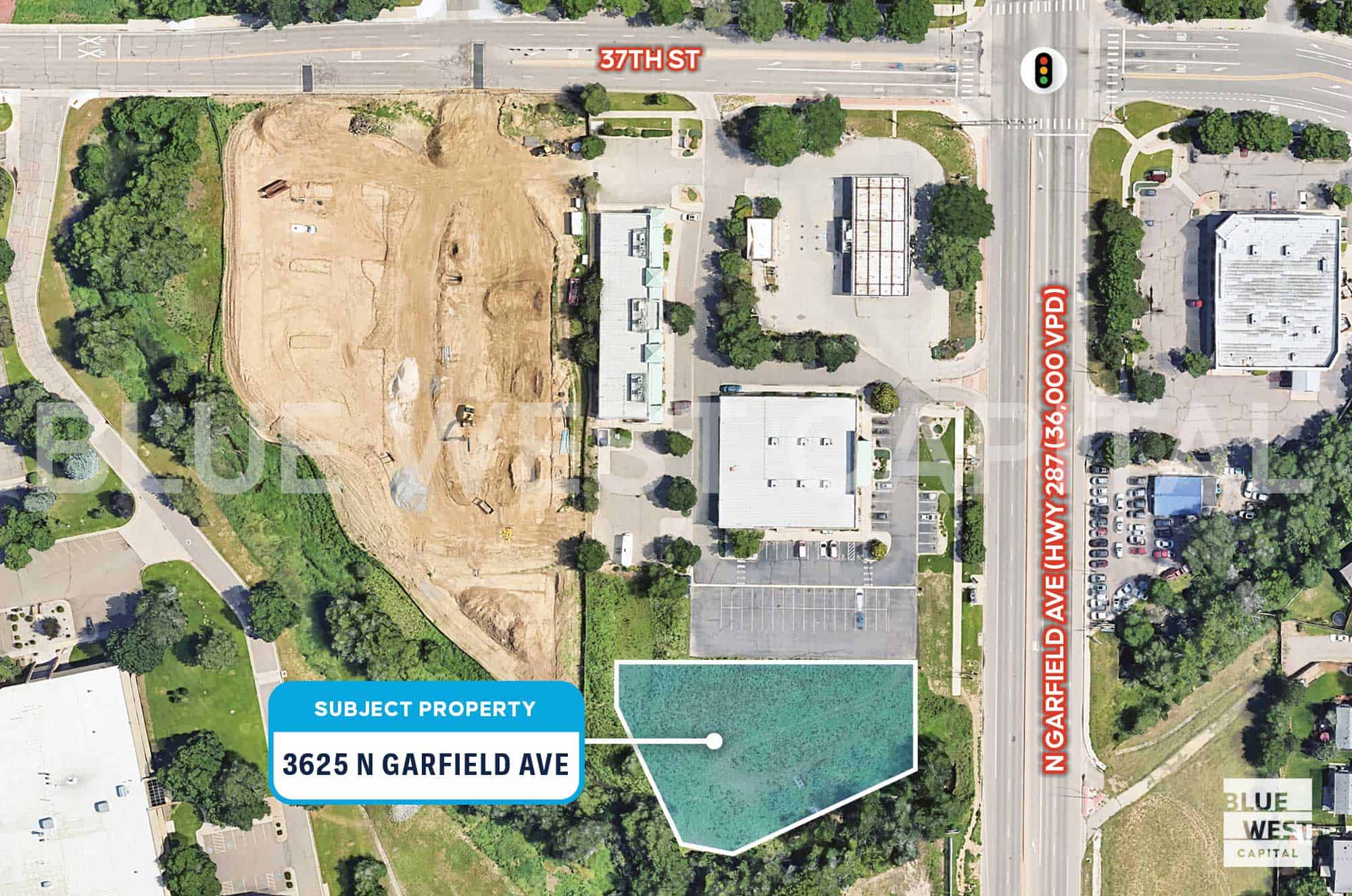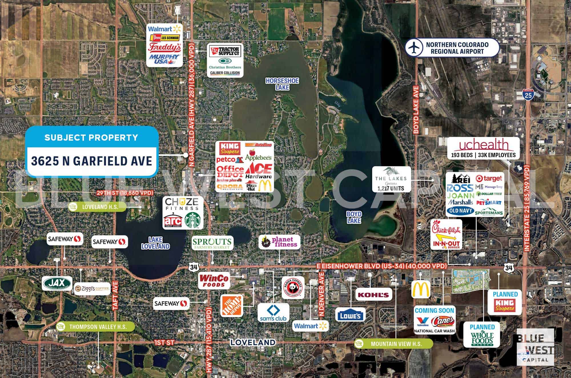 Blue West Capital is pleased to present 3625 N Garfield Avenue, a 0.80 acre pad site along N Garfield Ave. (US-287) in Loveland, CO. Located just north of The Orchards Shopping Center, which draws 2.9 million annual visitors, and adjacent to the new City of Loveland Transit Center, the site captures both strong vehicle and consistent daily foot traffic. With exposure to more than 36,000 vehicles per day and near established national retailers, this property offers a premier location for high-visibility retail or service-oriented development.