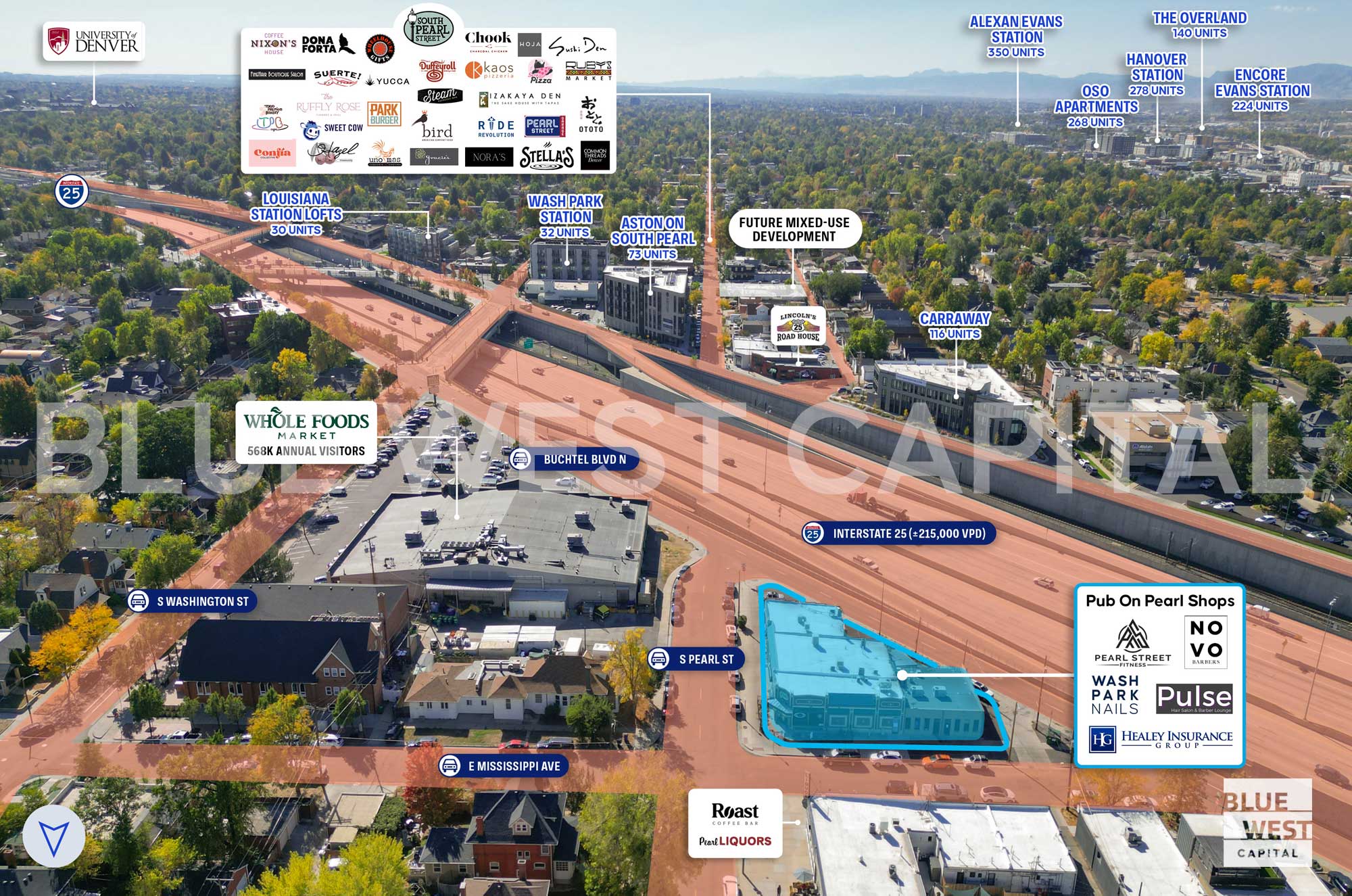 This value-add investment offers significant upside in re-leasing the Pub on Pearl space (41% of GLA), converting gross leases to triple net leases, and marking rents to market during lease rollover. The property benefits from a strong mix of service-based tenants. It has 15 onsite parking spaces and plenty of adjacent street parking. Positioned on the northwest corner of South Pearl Street and Buchtel Boulevard north, the property benefits from the dense and affluent surrounding neighborhoods as well as the highly trafficked Whole Foods Market immediately to the east.