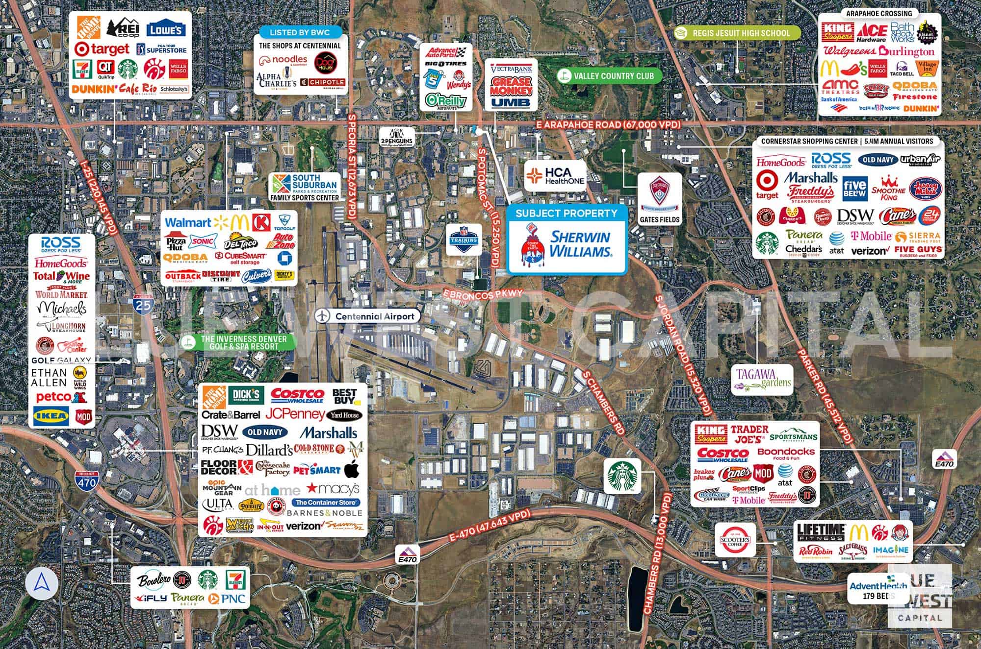 Blue West Capital is pleased to offer for sale a single-tenant Sherwin-Williams located in Centennial, CO (Denver MSA). The property is conveniently located at the signalized corner of E Arapahoe Rd (67,000 VPD) and S Potomac St (15,250 VPD).