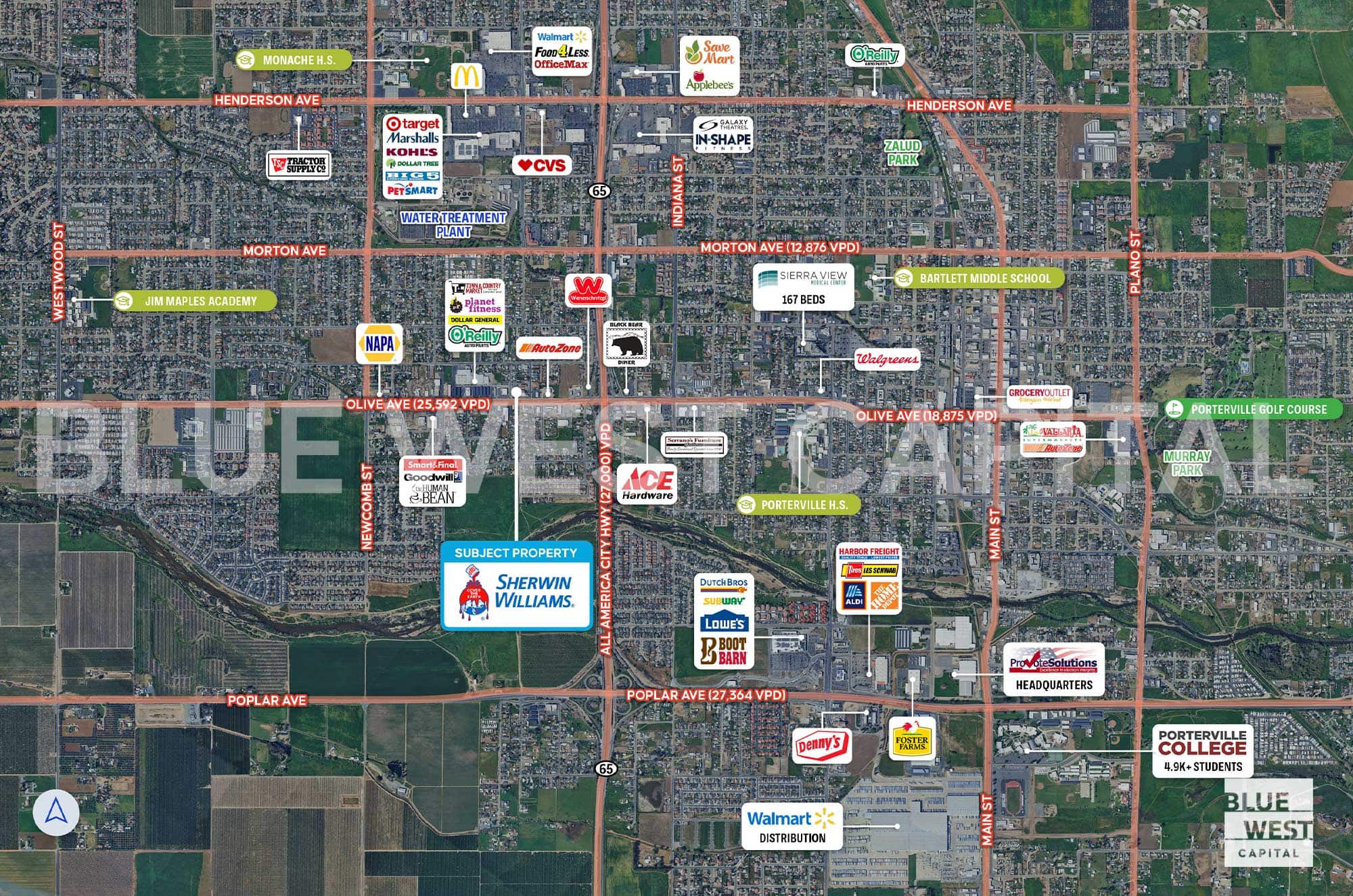 Blue West Capital is pleased to offer for sale a single-tenant Sherwin-Williams located in Porterville, CA (Visalia-Porterville MSA). The property is conveniently located at the intersection of Olive Ave (25,500+ VPD) and N Dameron St.
